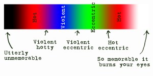 Assign a colour to each criteria using the RGB colour mode. Let’s say Hotness is Red, Eccentricity is Green and Violence is Blue.