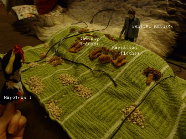 Here is my representation of the French and Russian dispositions at the start of the battle, fashioned from a tea towel and things I found in the cupboard.