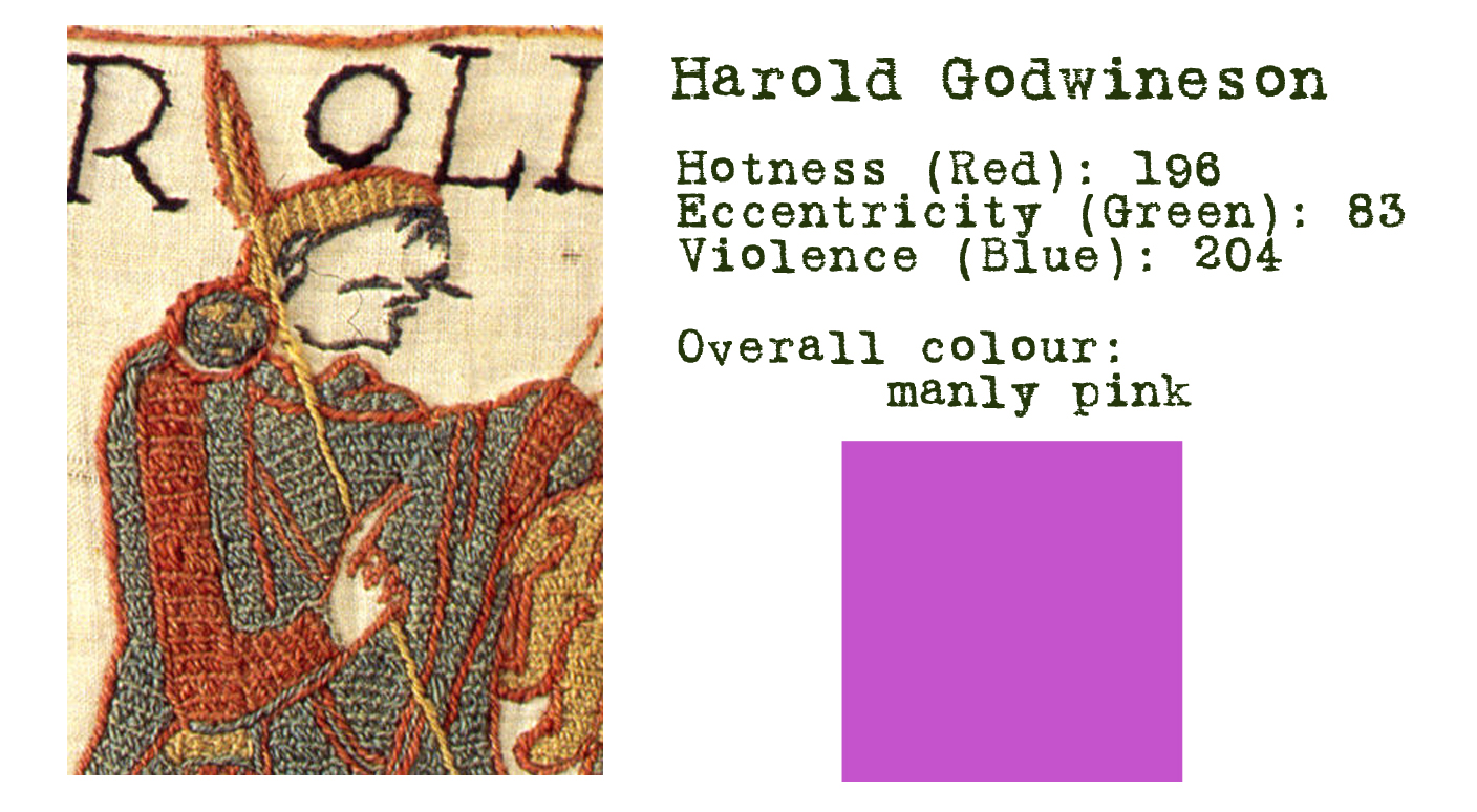 Eccentricity (green): 83. Harold was a paragon of Anglo-Saxon noble virtue, excelling in all the conventional manly arts of godliness, violence, diplomacy, hunting and the growing of facial hair.
