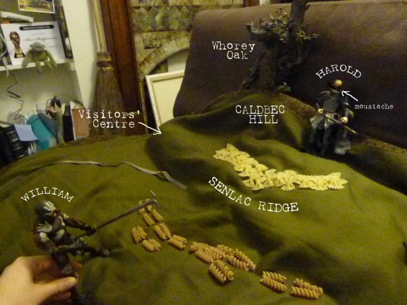 Harold headed south, completing the 300ish miles to Hastings in about 11 days (with a three-night mini-break in London). He drew his army up on Senlac Hill on the morning of October 14th, a little bit tired and sweaty (but in a manly and not unattractive way).