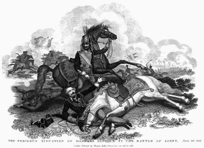 In his customary style, Blücher insisted on leading from the front at the Battle of Ligny, with the result that he had his horse (a fine stallion given to him by the Prince Regent) shot from under him. He was only saved by his aide who stood over him until Prussian soldiers could lift the horse off Blücher and carry him back. They then carelessly lost the Field-Marshal among the wounded.